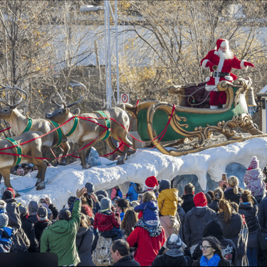 And of course, Santa Claus is the star of the show. By tradition, Santa’s float comes last, and it’s always a showstopper. You’ll likely spot Santa’s bright red sleigh, adorned with golden bells and garland, drawn by model reindeer “leaping” as if in flight. Santa himself stands or sits up high, waving his white-gloved hand enthusiastically to all. “Ho ho ho! Joyeux Noël!” he’ll bellow, bridging Montreal’s bilingual spirit by wishing Merry Christmas in French and English. Often Mrs. Claus is by his side, and a cadre of cheery elves perch on the sleigh or walk alongside handing out waves – sometimes even handing small treats or candy to kids along the route. Seeing Santa arrive is the emotional highlight; for many families, it officially “starts Christmas” in their hearts.